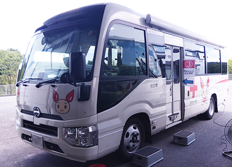 日本赤十字社「兵庫県赤十字血液センター」様ご協力のもと、当日は移動採血車(献血バス)に来ていただきました。