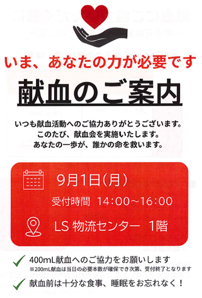 9月1日、本社・物流センター敷地内で献血活動を行いました。
