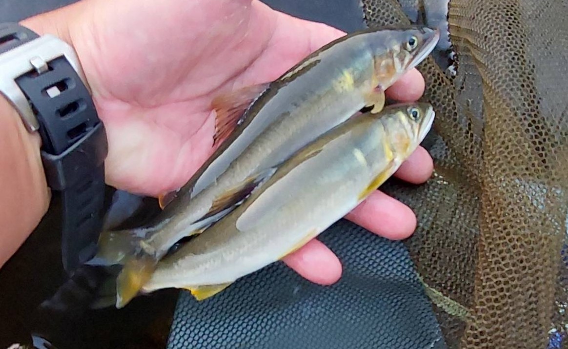 鮎は石についた苔をはむので、その際はギラッと平打ちし、それが、個体数目視の目安にもなります。