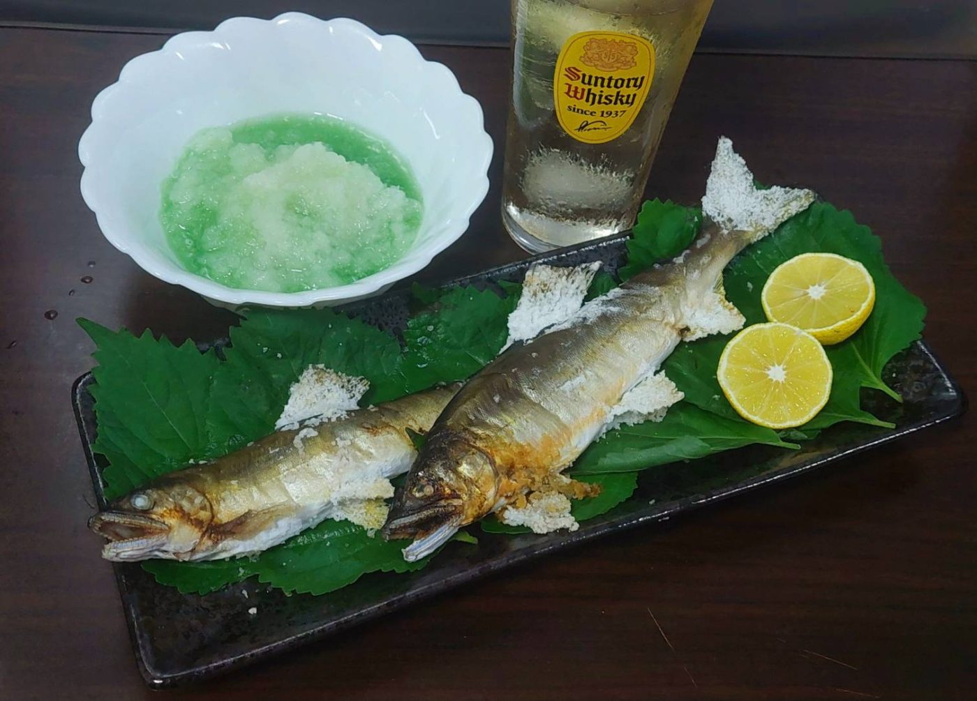 釣れた鮎は、焼いてタデ酢おろしで爽やかに美味しく頂きました。20㎝を超えると、中骨周りの脂の量と質が違い、旨いいですね。