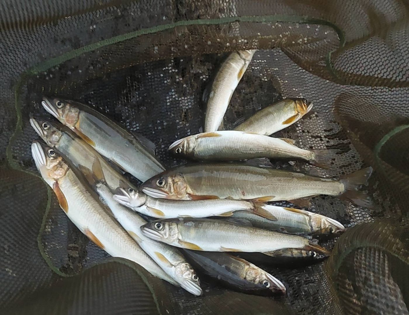 深みのトロ場などで、大量の良型見え鮎もいましたが、群れ鮎は縄張り意識が少なく、ルアーにアタックしにくいです。