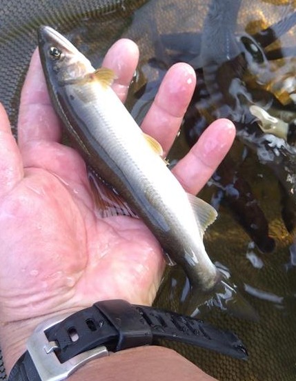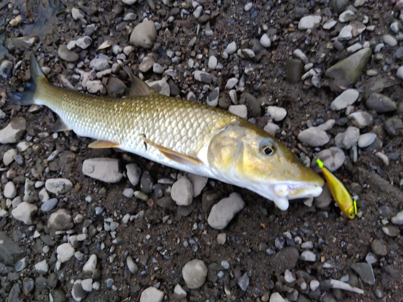 ラストは60㎝近いニゴイが掛かりましたが、希少なルアーを無くさぬように、魚に追従して川を下り無事ランディング。他の鮎ルアー河川でもニゴイやウグイ・ハスなどが掛かる事はよくあるようです。