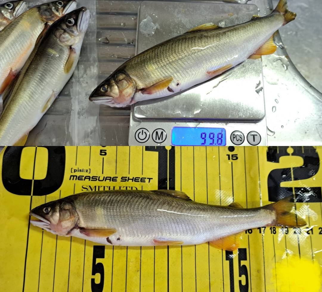 そのような場所をしつこく・丁寧に狙うためには、複雑な流れのある中でラインとルアーコントロールが最重要です。ただ泳がすだけでは、余程活性がいい時でないと当たらないので、キーポイントは止めることとヒラを打たせて怒らせることです。なによりもルアーの位置・水深が見えることは、非常に重要で今回も【鮎ルアー目印リーダー】の効果は絶大でした。平均サイズは小さかったですが、最大20.8cmで99.8gの居残りグッドサイズも混じり、鮎ルアーでの匹数、重量ともに記録更新することができました。