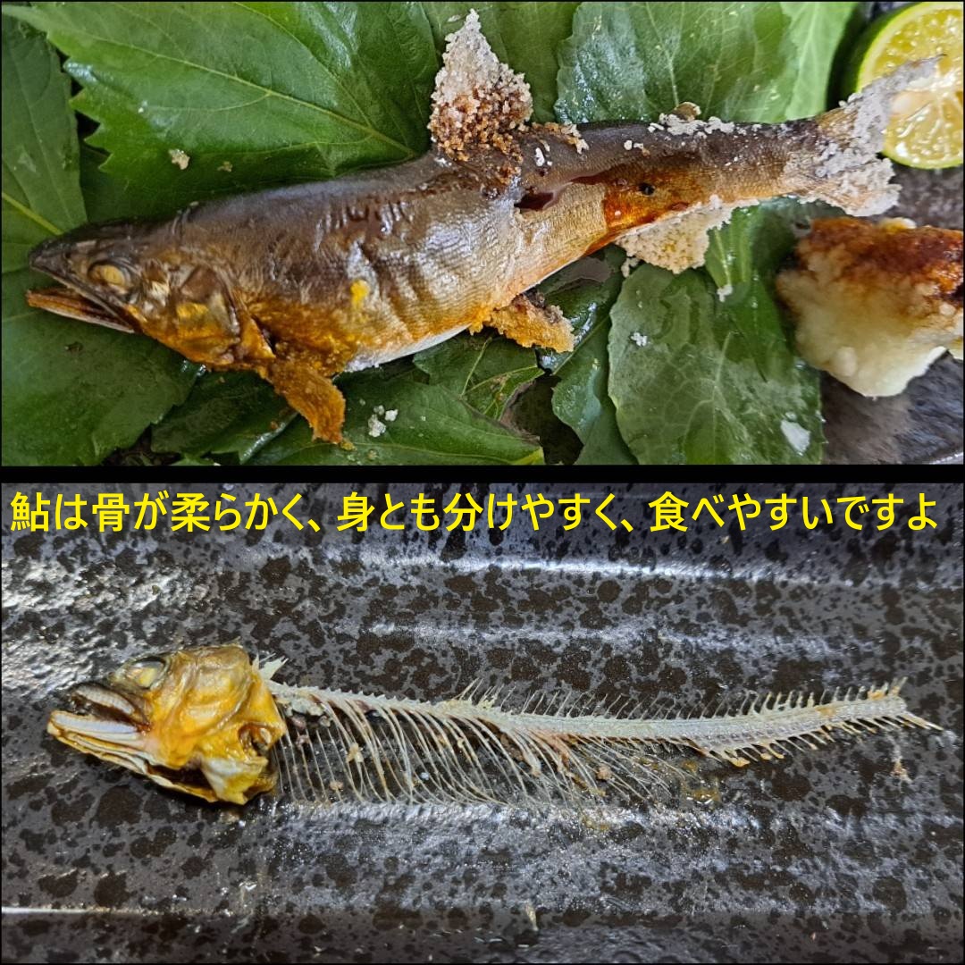 釣った唯一の鮎は塩焼きにしました。鮎の骨も柔らかく、骨と身が綺麗に分かれるために食べ易く美味しくいただきました。