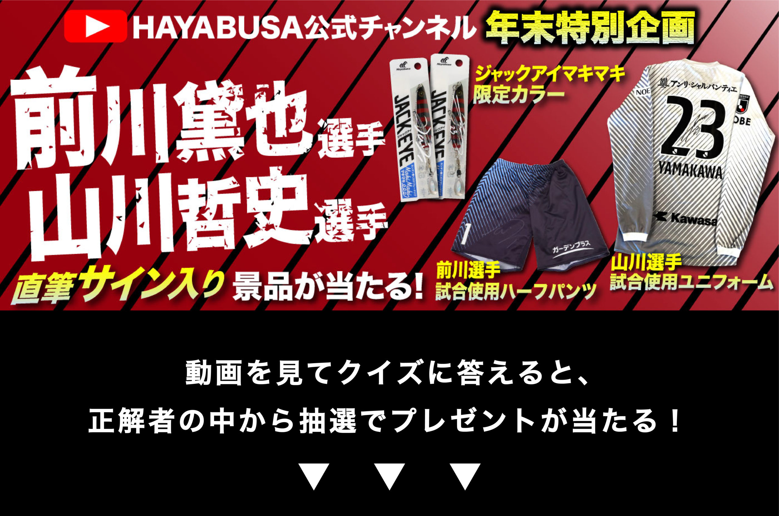 前川選手サイン入りジャックアイマキマキ(オリジナルカラー)2名 山川選手サイン入りジャックアイマキマキ(オリジナルカラー)2名 前川選手サイン入りパンツ 1名 山川選手サイン入りユニフォーム 1名 |